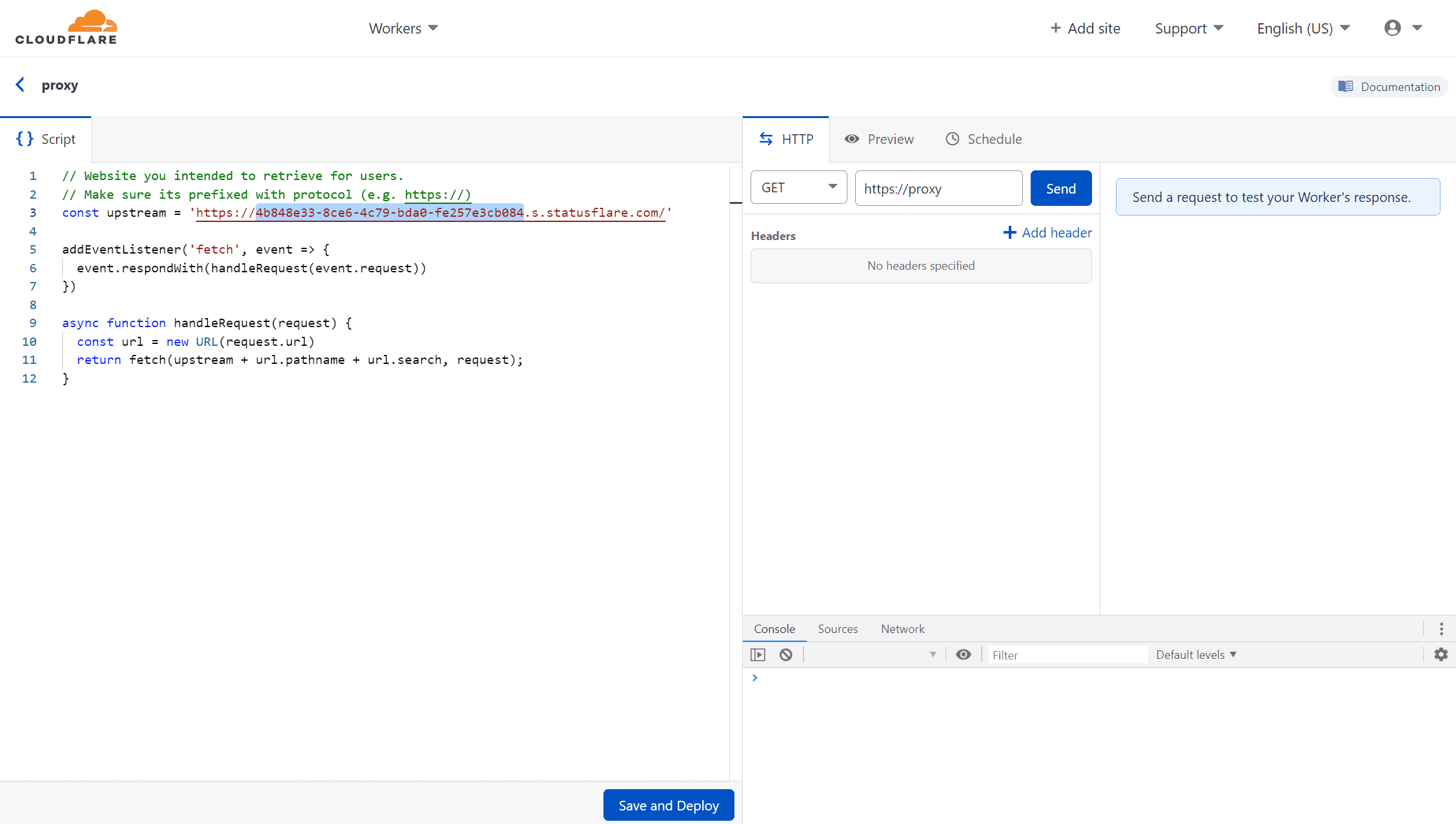 worker proxy template// Website you intended to retrieve for users.// Make sure its prefixed with protocol (e.g. https://)const upstream = 'https://[uuid].s.statusflare.com'