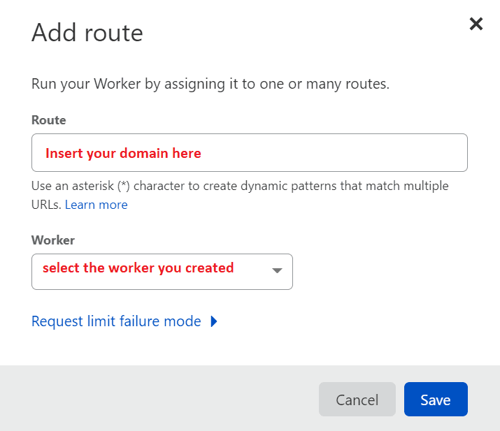 Press the gray button "Add Route," insert the domain name you set earlier, and select your worker from the dropdown.