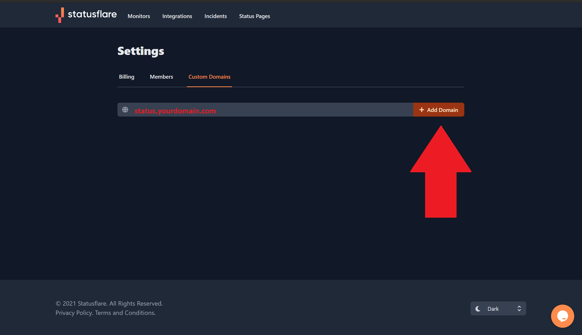 Go to the "custom domains" tab of the settings page. (https://dash.statusflare.com/settings/custom-domains/)