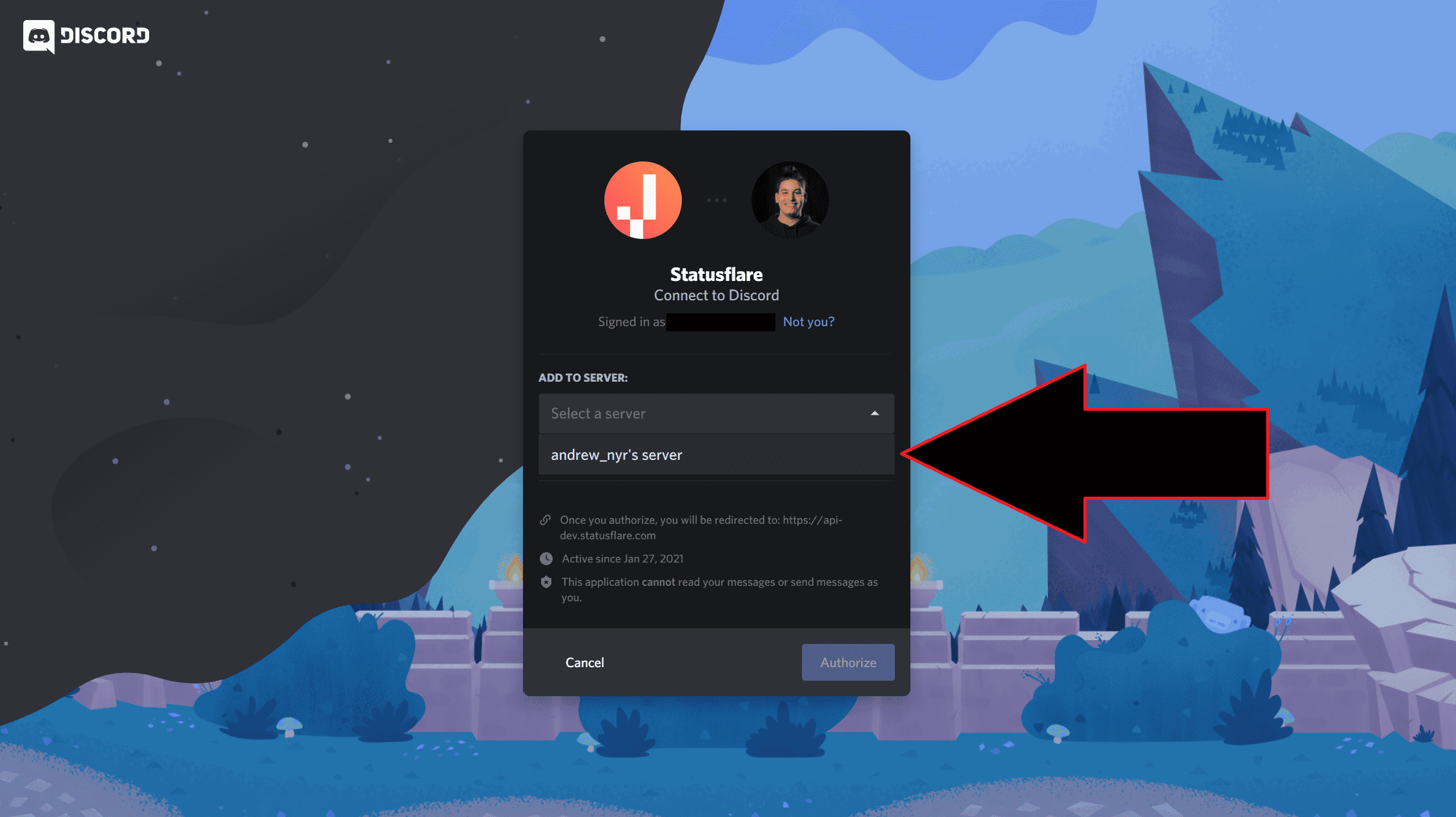 After you select "Discord" and press configure, you will be taken to a discord login screen. Once logged in, you will be asked what server you would like to attach to Statusflare.