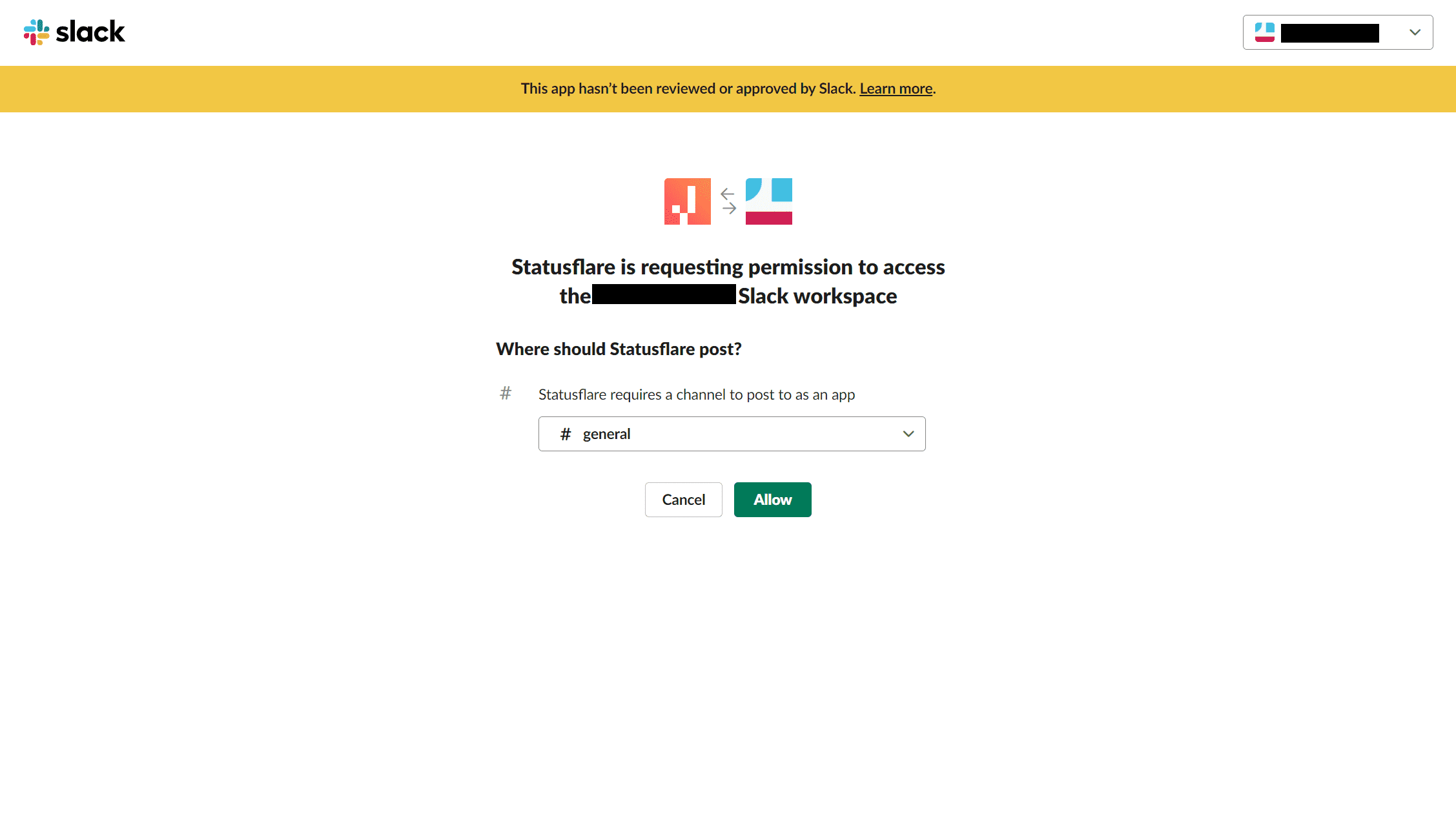 After you select "Slack" and press configure, you will be taken to a slack login screen. Once logged in, you will be asked what workspace you would like to attach to Statusflare.